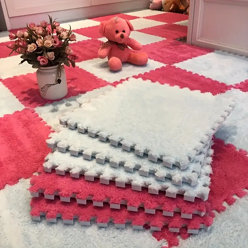 12pcs Pink Plush Riddle Foam Floor Cushion For The Girl's Room, Square Interlocking Cushion, Fluffy Area Cushion, Protective Non-slip Cushion Foam, Floor Cushion, Living Room Nursery Room Decoration,