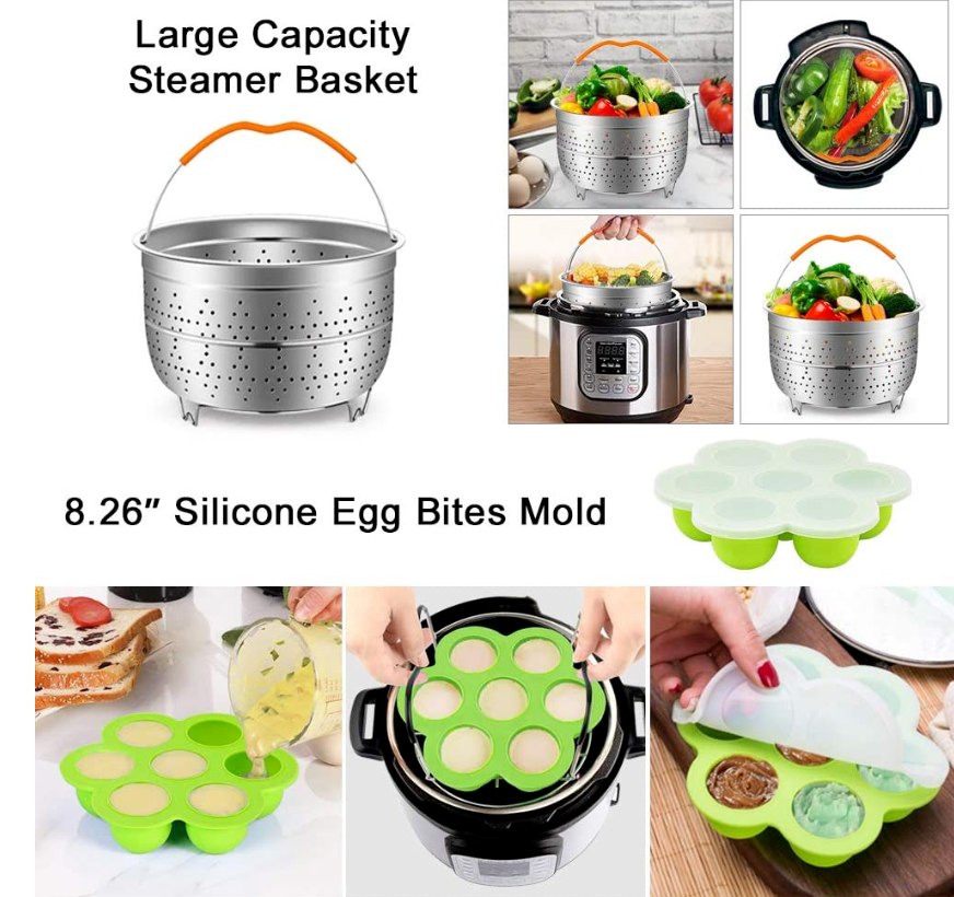 • ★[21 Pcs Instant pot accessories] Pressure cooker acessories provide all you needs for delicious foods. It includes 1 Large capacity steamer basket, 1 Springform Pan, 1 Steamer basket with divider, 1 Egg Bites Mold, 1 Stackable Egg Steamer Rack , 1 Steamer Rack Trivet with Heat Resistant Handles, 1 kitchen Tong, 1 Silicone Spatula, 2 Oven Mitts,3 Magnetic Cheat Sheets,1 CookBook(Instruction & Recipes), 6 in 1 Measuring Spoons,1 Gift Box,1*60 Pcs Parchment Steamer Papers Liners