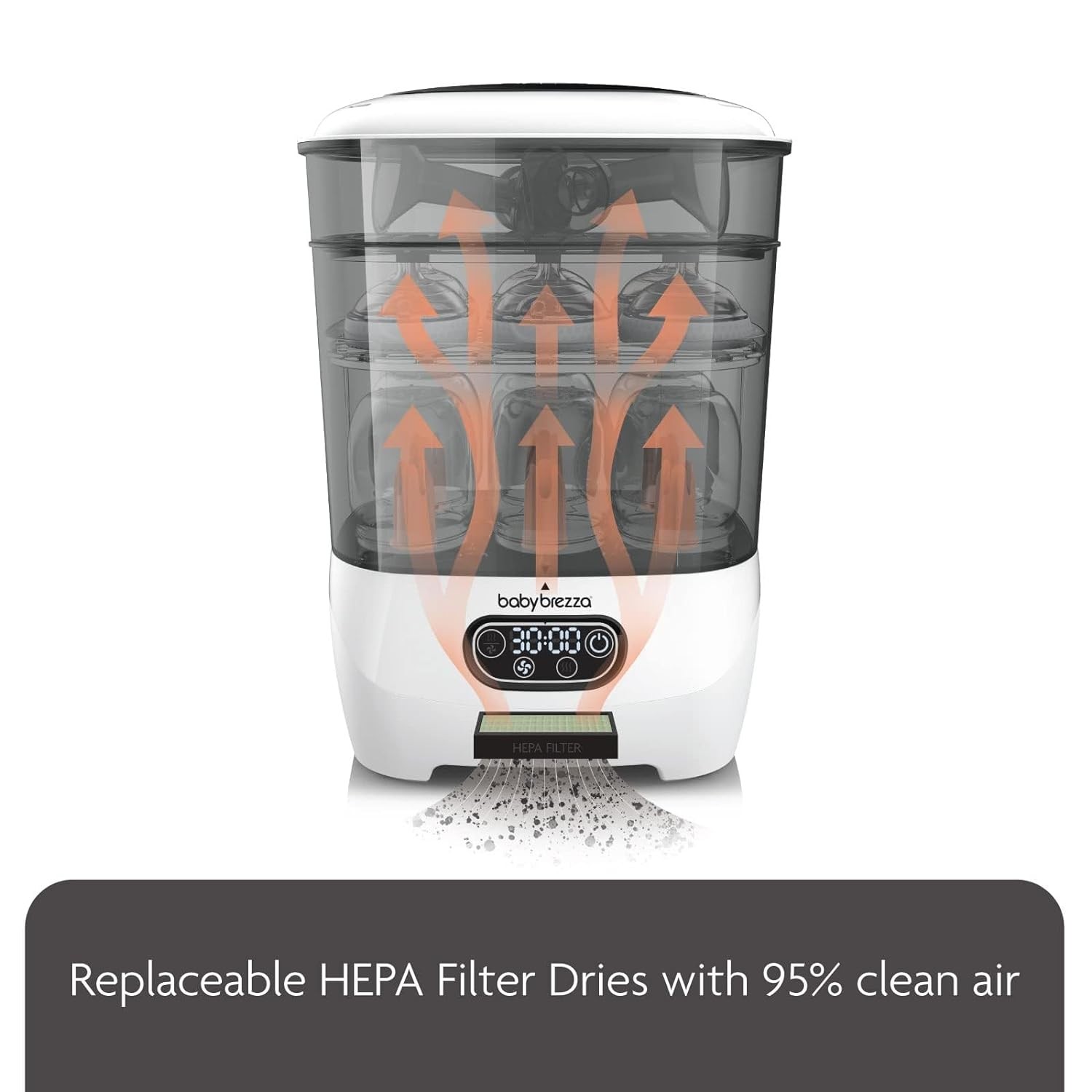 • Natural steam effectively sterilizes any brand/size of bottles, pump parts & accessories; Then dries with replaceable HEPA-Filtered air that’s 95% germ-free; Products remain sterilized inside for up to 24 hours