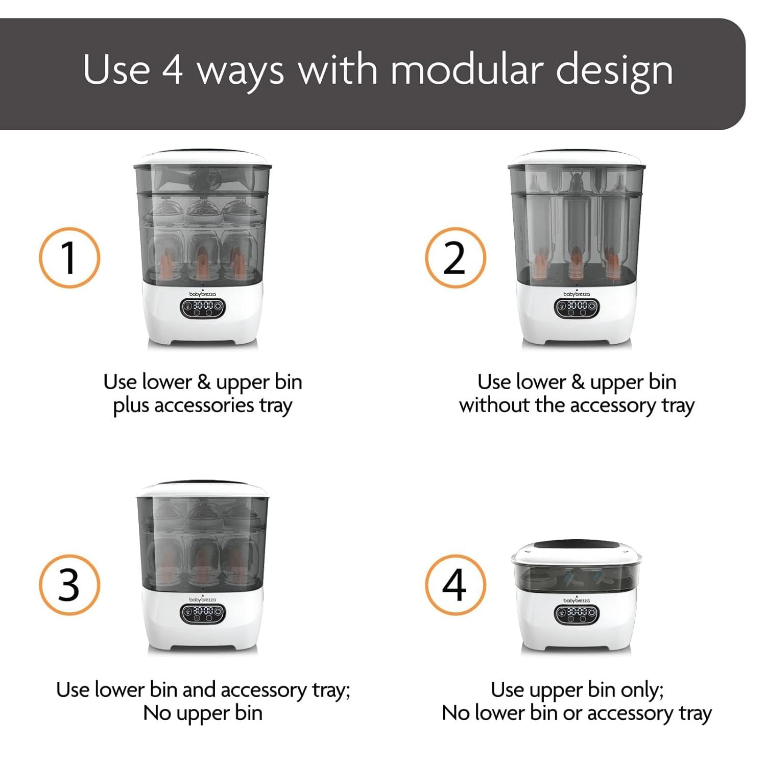 • Use 4 ways and features 4 functions: Features large lower bin, shorter upper bin and unique accessory tray; Use as a Sterilizer & Dryer, Sterilizer Only, Dryer Only or Storage System and never use a dirty drying rack again