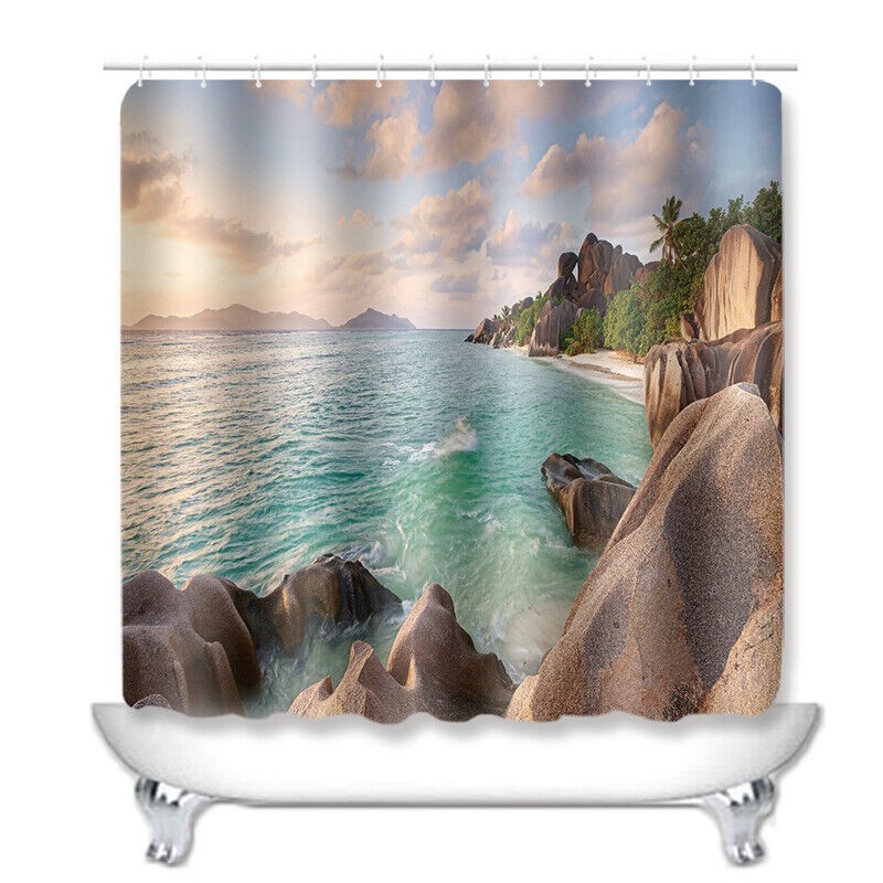 Fitted with C-shaped curtain hooks. - Designed to fit standardized bath tubs. - Prevent water from splashing out of the shower stall. - Ideally suits most standard sized bathrooms; just hang it on steel tube. - Images imprinted using heat dye sublimation technique for lasting effects.