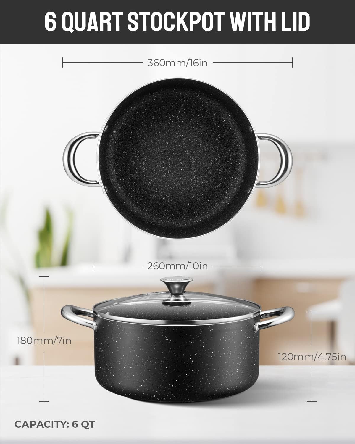 Cooking Pot with Lid, 6 Quart Nonstick Stock Pot/Stockpot with Lid, Non Stick 6 QT Large Capacity Induction Pot for Soup, Broth, Chili, Stew - All Stove Compatible