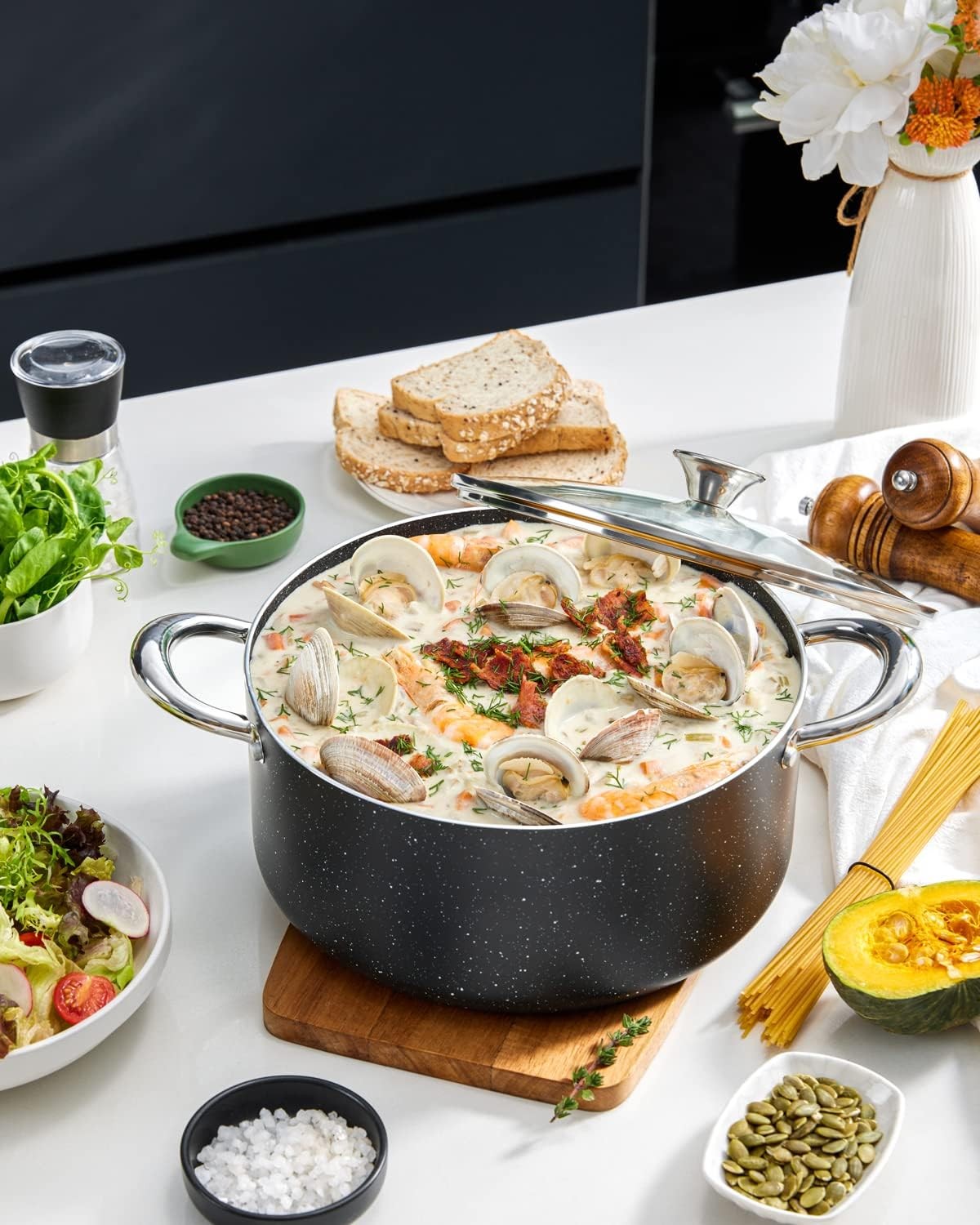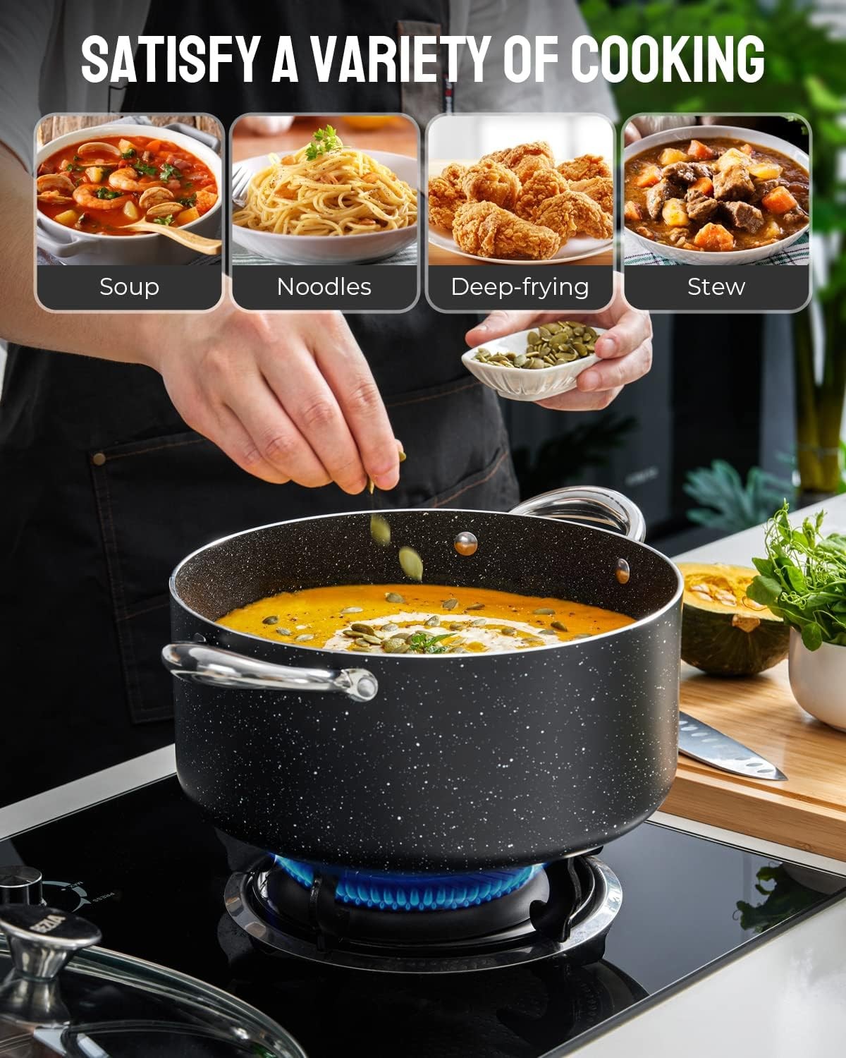 • QUICK & EVEN COOKING - The BEZIA stock pot features a triple induction-ready base and durable aluminum alloy core, which distributes heat evenly, allowing for the perfect simmer, and providing deliciously and perfectly cooked foods daily.