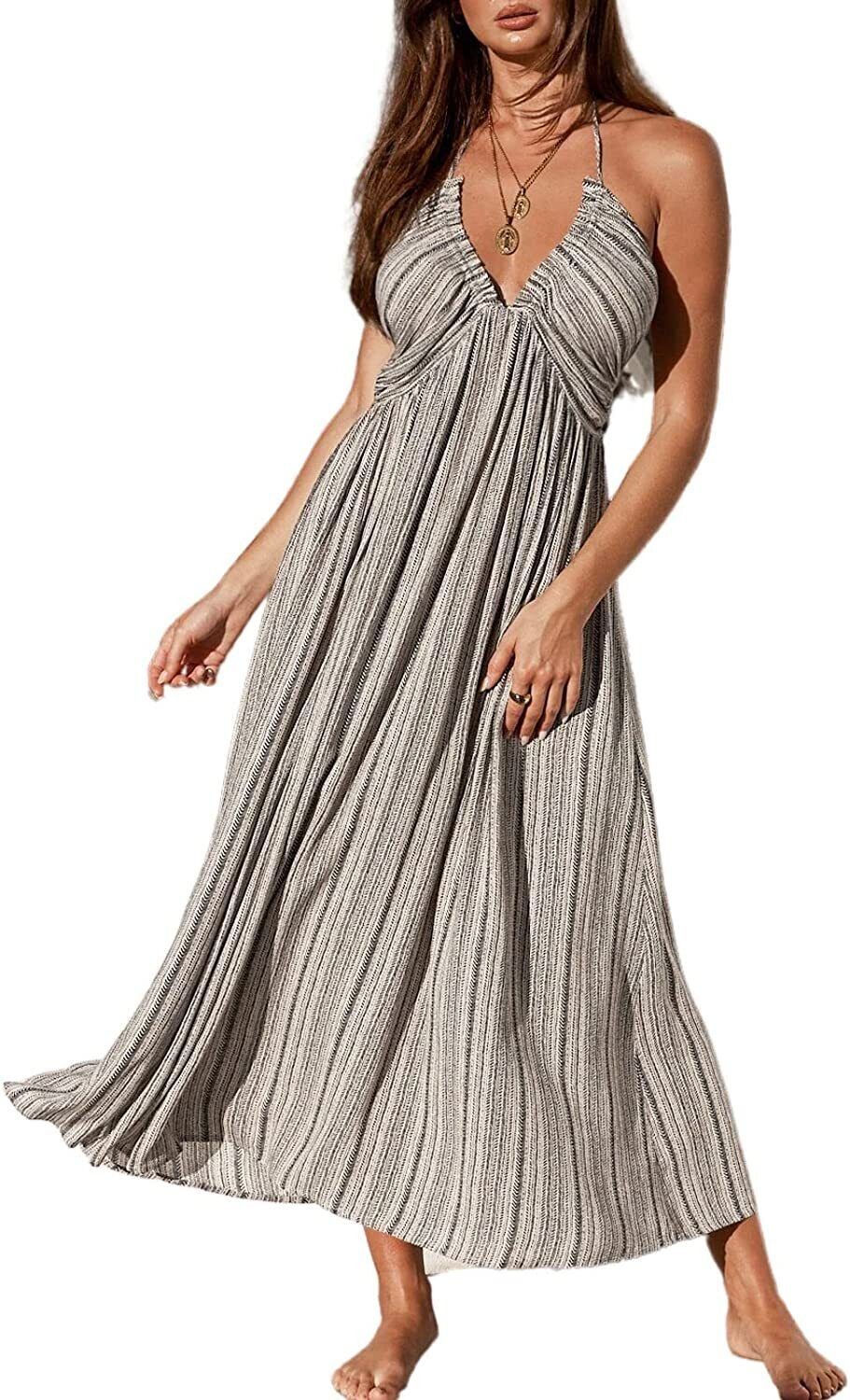 CUPSHE Women Summer Halter Smocked Maxi Dress Plunge Sleeveless Long Solid Fitte