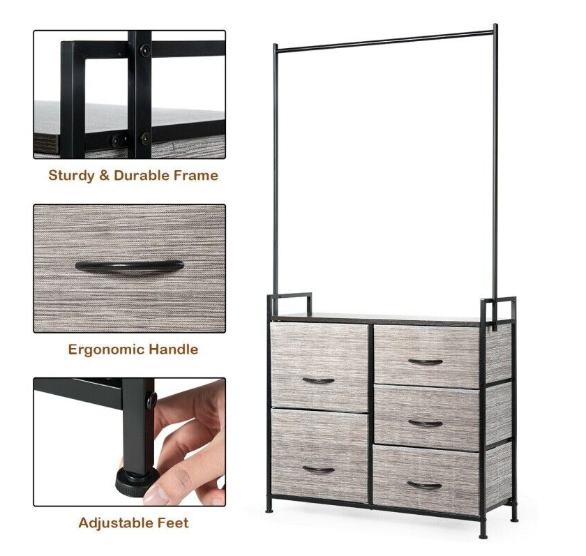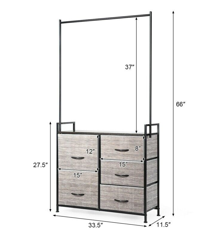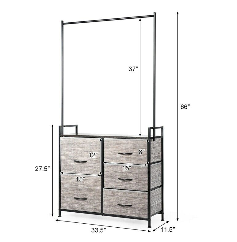 This organizer has five drawers of different sizes to help you store clothes, toys, towels, etc. The hanging rod is wide enough to hang clothes and other accessories. Made of a sturdy steel tube and high-density materials, the entire organizer is stable and features a high weight-bearing capacity.