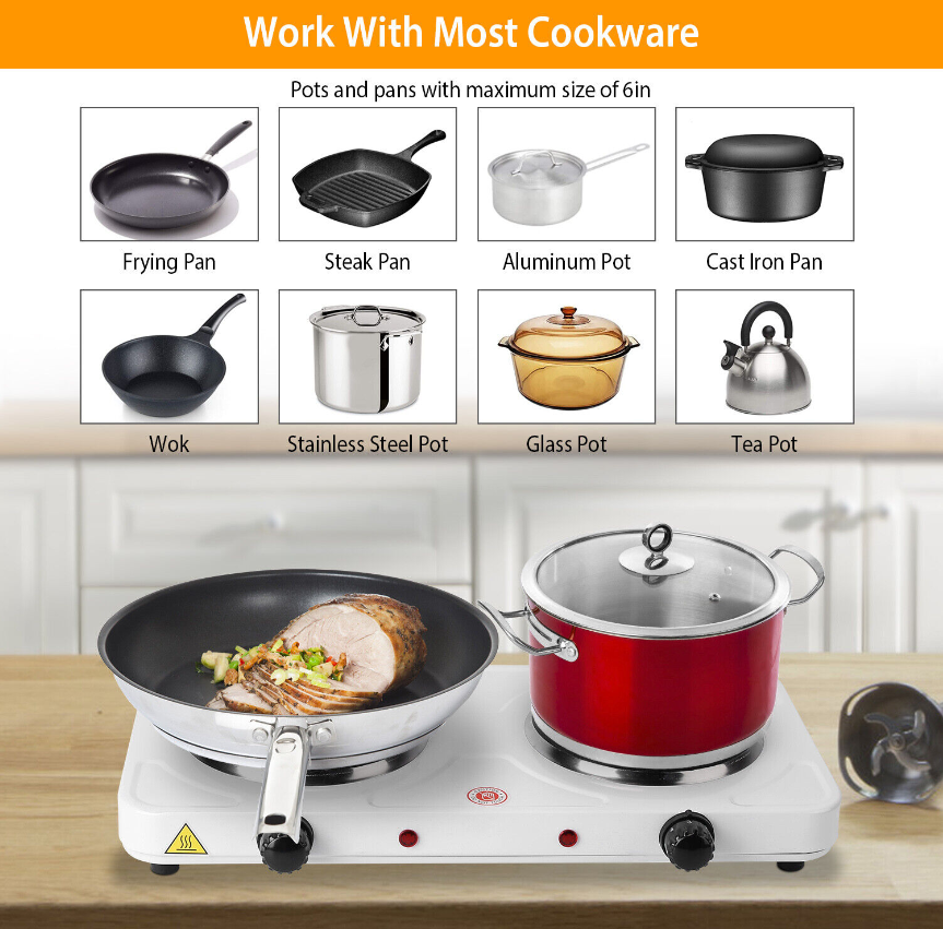 • Wide Compatibility:The burner can be used with any flat-bottomed cookware made of a variety of materials,such as frying pans,woks or stovetop teapots made from aluminum,stainless steel,iron or glass. Note:May heat ceramic pot very slowly.