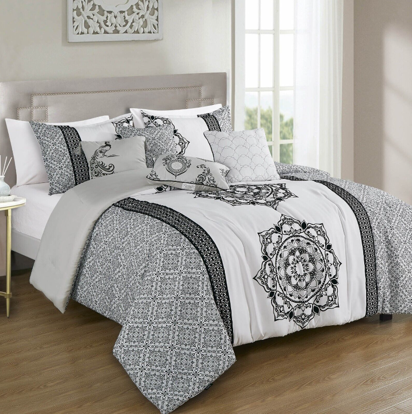 HIG 7-Piece Luxury Embroidery/Print Comforter Set Bed in A Bag -Queen/King Size
