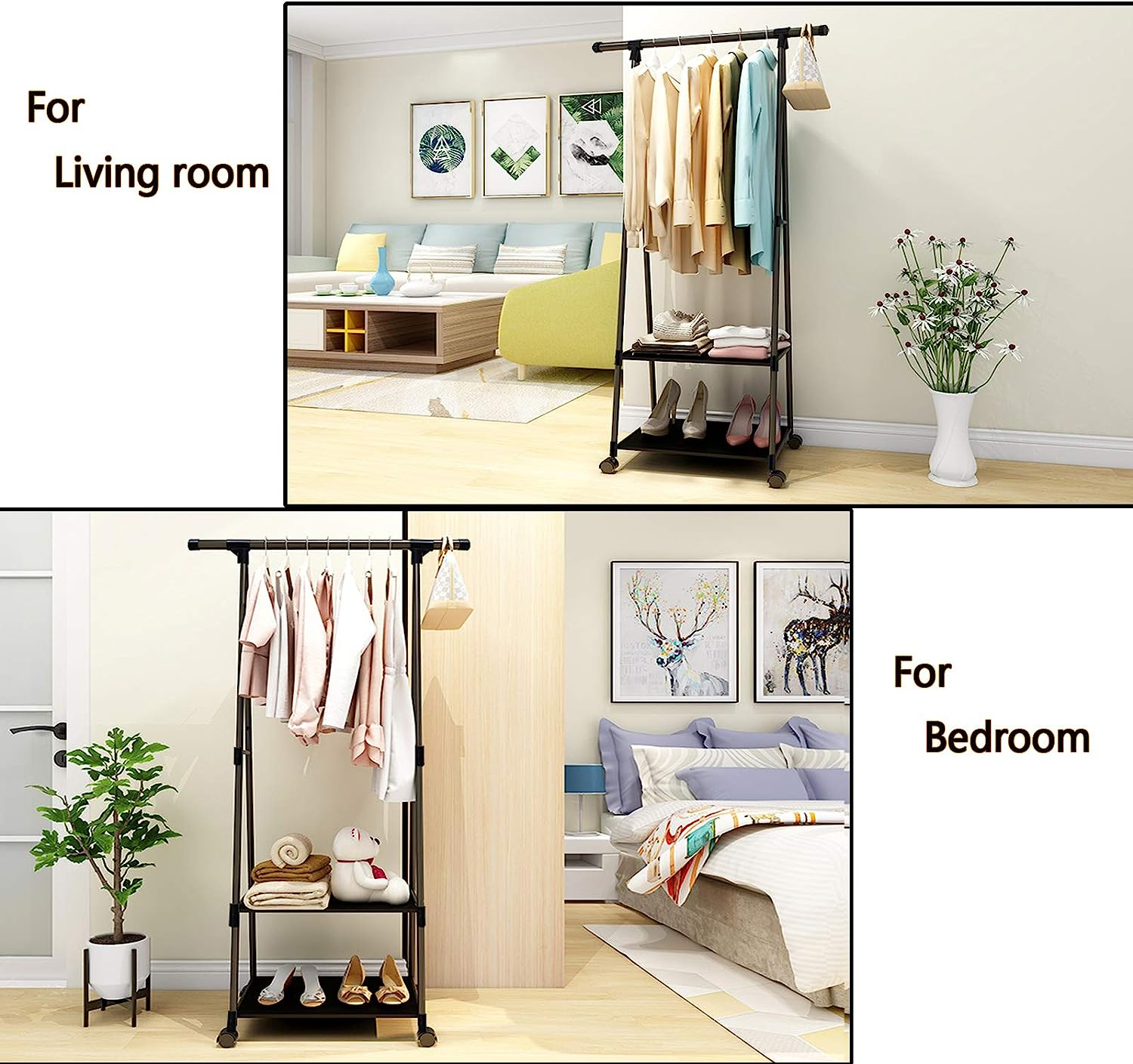 Jecpuo Clothes Rack Small Metal Garment Rack with Shelves for bedroom Rolling on