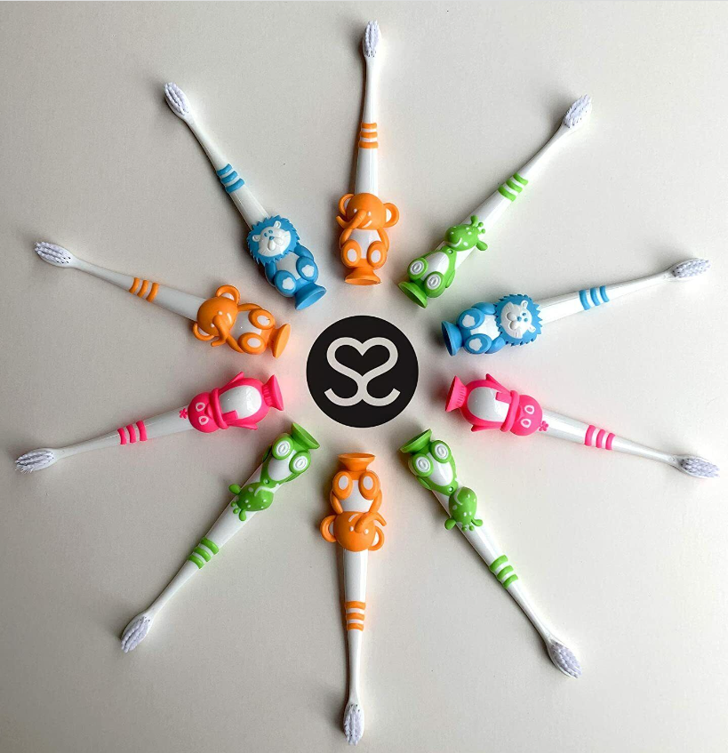 Nothing is too good for your kids health! The Kidz Glee toothbrush was made with that thought in mind. Ultra soft bristles that provide an extremely gentle yet effective clean. Don't be fooled by the ultra soft bristles. They are easier on teeth and gums but not easier on bacteria or plaque. Dentists say that hard bristles actually begin to remove the enamel from your teeth which isn't good. Tongue and cheek cleaner on back of head promotes fresh breath and it also teaches your kids healthy brushing habits at a young age. The Kidz Glee is well made helping your kids become accustomed to quality. Small head to fit into little mouths. Four happy animal shaped handles with suction cup base and rubber grip. Your kids will love this toothbrush and their mouths will too! The American Dental Association recommends that you change your toothbrush at least every 90 days. Colors vary