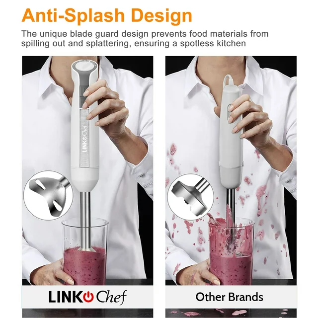 • 【5-in-1 Hand Blender Kit 】Hand blender contains whisk, mixer,milk frother, 500ml chopper and 600ml measuring cup. Our product is the perfect combination for family tasks, such as chopping, whisking, whipping, juice or puree. It meets your needs!