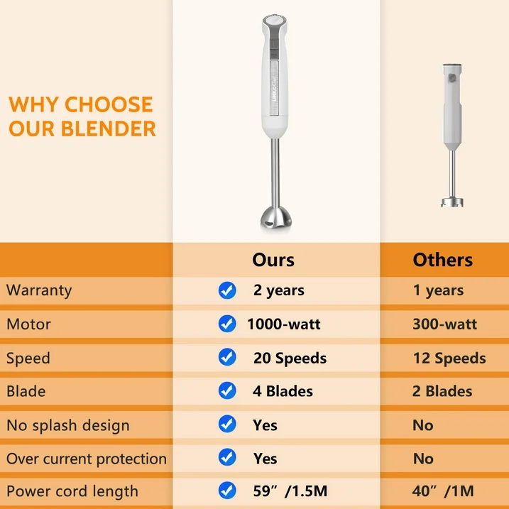 • 【Immersion Blender 1000W】Also known as a hand blender,equipped with all copper motor.It offer maximum power 1000 watts,Just press blender with one hand for a few seconds, the evenly mixed smoothies, baby food, protein shakes, sauces,salad,squash soup and mayonnaise. Adopt the four-leaf sharp 304 stainless steel blade. Make food mixing more effective, even and smooth.