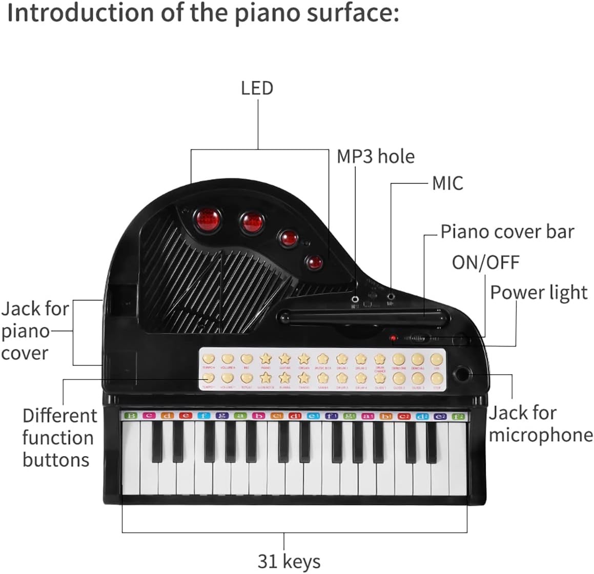 • [More Functionality, More Fun]—Kids piano is equipped with 31Keys, 8 percussion instruments, 3 teaching modes, 4 musical instruments,4 accompaniment styles, 22 demo songs, lights, Record & playback function and adjustable volume and rhythm. More functions will bring more fun to your child.